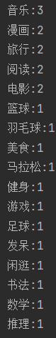 1 datas = {'2049777001': ['篮球', '羽毛球', '美食', '漫画'], 2 '2049777002': ['音乐', '旅行'], 3 '2049777003': ['马拉松', '健身', '游戏'], 4 '2049777004': [], 5 '2049777005': ['足球', '阅读'], 6 '2049777006': ['发呆', '闲逛'], 7 '2049777007': [], 8 '2049777008': ['书法', '电影'], 9 '2049777009': ['音乐', '阅读', '电影', '漫画'], 10 '2049777010': ['数学', '推理', '音乐', '旅行'] 11 }