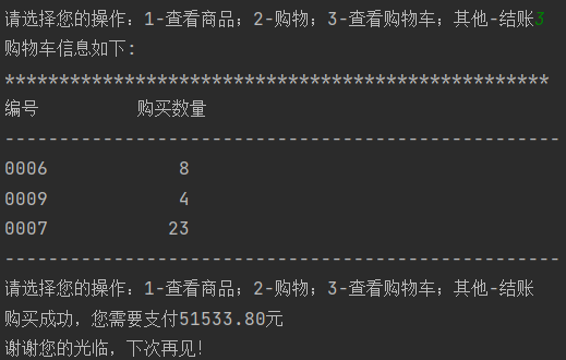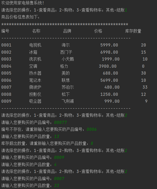 1 """ 2 家用电器销售系统 3 v1.3 4 """ 5 6 #欢迎信息 7 print('欢迎使用家电销售系统!') 8 9 #商品数据初始化 10 products = [ 11 ['0001', '电视机', '海尔', 5999.00, 20], 12 ['0002', '冰箱', '西门子', 6998.00, 15], 13 ['0003', '洗衣机', '小天鹅', 1999.00, 10], 14 ['0004', '空调', '格力', 3900.00, 0], 15 ['0005', '热水器', '美的', 688.00, 30], 16 ['0006', '笔记本', '联想', 5699.00, 10], 17 ['0007', '微波炉', '苏泊尔', 480.00, 33], 18 ['0008', '投影仪', '松下', 1250.00, 12], 19 ['0009', '吸尘器', '飞利浦', 999.00, 9] 20 ] 21 #初始化用户购物车 22 products_cart = [] 23 24 option = input('请选择您的操作:1-查看商品;2-购物;3-查看购物车;其他-结账') 25 while option in ['1', '2', '3']: 26 if option == '1': 27 #产品信息列表 28 print('商品价格信息表如下:') 29 print('*' * 50) 30 print('%-10s' % '编号', '%-10s' % '名称', '%-10s' % '品牌', '%-10s' % '价格', '%-10s' % '库存数量') 31 print('-' * 51) 32 for i in range(len(products)): 33 print('%-10s' % products[i][0], '%-10s' % products[i][1], '%-10s' % products[i][2], '%10.2f' % products[i][3], '%10d' % products[i][4]) 34 print('-' * 51) 35 elif option == '2': 36 products_id = input('请输入您要购买的产品编号:') 37 while products_id not in [item[0] for item in products]: 38 products_id = input('编号不存在,请重新输入您要购买的产品编号:') 39 40 count = int(input('请输入您要购买的产品数量:')) 41 while count > products[int(products_id)-1][4]: 42 count = int(input('库存超出数量,请重新输入您要购买的产品数量:')) 43 44 #将所购买的商品加入购物车 45 if products_id not in [item[0] for item in products_cart]: 46 products_cart.append([products_id, count]) 47 else: 48 for i in range(len(products_cart)): 49 if products_cart[i][0] == products_id: 50 products_cart[i][1] += count 51 52 #更新商品列表 53 for i in range(len(products)): 54 if products[i][0] == products_id: 55 products[i][4] -= count 56 else: 57 print('购物车信息如下:') 58 print('*' * 50) 59 print('%-10s' % '编号', '%-10s' % '购买数量') 60 print('-' * 51) 61 for i in range(len(products_cart)): 62 print('%-10s' % products_cart[i][0], '%6d' % products_cart[i][1]) 63 print('-' * 51) 64 option = input('请选择您的操作:1-查看商品;2-购物;3-查看购物车;其他-结账') 65 66 #计算金额 67 if len(products_cart) > 0: 68 amount = 0 69 for i in range(len(products_cart)): 70 products_index = 0 71 for j in range(len(products)): 72 if products_cart[i][0] == products[j][0]: 73 products_index = j 74 break 75 price = products[products_index][3] 76 count = products_cart[i][1] 77 amount += price*count 78 79 if 5000 < amount <= 10000: 80 amount *= 0.95 81 elif 10000 < amount <= 20000: 82 amount *= 0.90 83 elif amount > 20000: 84 amount *= 0.85 85 print('购买成功,您需要支付%8.2f元' % amount) 86 87 #退出系统 88 print('谢谢您的光临,下次再见!')