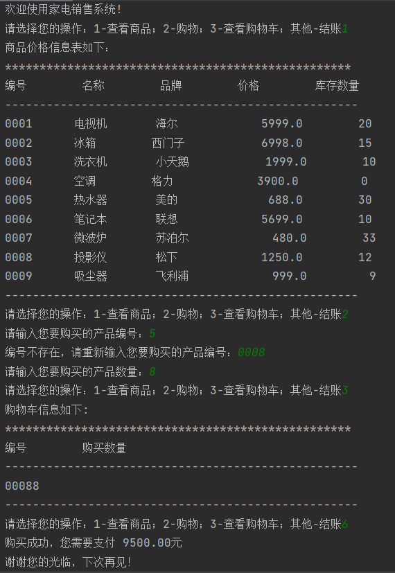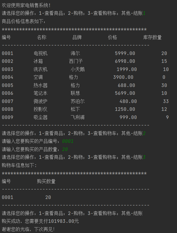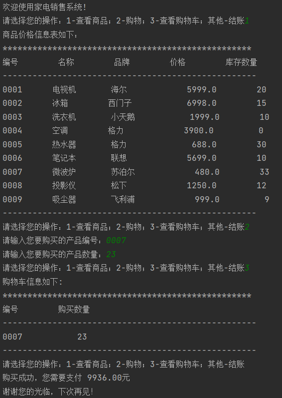 1 """ 2 家用电器销售系统 3 v1.4 4 """ 5 6 #欢迎信息 7 print('欢迎使用家电销售系统!') 8 9 #商品数据初始化 10 products=[ 11 {'id':'0001','name':'电视机','brand':'海尔','price':5999.00,'count':20}, 12 {'id':'0002','name':'冰箱','brand':'西门子','price':6998.00,'count':15}, 13 {'id':'0003','name':'洗衣机','brand':'小天鹅','price':1999.00,'count':10}, 14 {'id':'0004','name':'空调','brand':'格力','price':3900.00,'count':0}, 15 {'id':'0005','name':'热水器','brand':'格力','price':688.00,'count':30}, 16 {'id':'0006','name':'笔记本','brand':'联想','price':5699.00,'count':10}, 17 {'id':'0007','name':'微波炉','brand':'苏泊尔','price':480.00,'count':33}, 18 {'id':'0008','name':'投影仪','brand':'松下','price':1250.00,'count':12}, 19 {'id':'0009','name':'吸尘器','brand':'飞利浦','price':999.00,'count':9}, 20 ] 21 #初始化用户购物车 22 products_cart = [] 23 24 option = input('请选择您的操作:1-查看商品;2-购物;3-查看购物车;其他-结账') 25 while option in ['1', '2', '3']: 26 if option == '1': 27 #产品信息列表 28 print('商品价格信息表如下:') 29 print('*' * 50) 30 print('%-10s' % '编号', '%-10s' % '名称', '%-10s' % '品牌', '%-10s' % '价格', '%-10s' % '库存数量') 31 print('-' * 51) 32 for i in range(len(products)): 33 print('%-10s' % products[i]['id'], '%-10s' % products[i]['name'], '%-10s' % products[i]['brand'], '%10.2f' % products[i]['price'], '%10d' % products[i]['count']) 34 print('-' * 51) 35 elif option == '2': 36 products_id = input('请输入您要购买的产品编号:') 37 while products_id not in [item['id'] for item in products]: 38 products_id = input('编号不存在,请重新输入您要购买的产品编号:') 39 40 count = int(input('请输入您要购买的产品数量:')) 41 while count > products[int(products_id)-1]['count']: 42 count = int(input('库存超出数量,请重新输入您要购买的产品数量:')) 43 44 #将所购买的商品加入购物车 45 if products_id not in [item['id'] for item in products_cart]: 46 products_cart.append({'id': products_id, 'count': count}) 47 else: 48 for i in range(len(products_cart)): 49 if products_cart[i]['id'] == products_id: 50 products_cart[i]['count'] += count 51 52 #更新商品列表 53 for i in range(len(products)): 54 if products[i]['id'] == products_id: 55 products[i]['count'] -= count 56 else: 57 print('购物车信息如下:') 58 print('*' * 50) 59 print('%-10s' % '编号', '%-10s' % '购买数量') 60 print('-' * 51) 61 for i in range(len(products_cart)): 62 print('%-10s' % products_cart[i]['id'], '%6d' % products_cart[i]['count']) 63 print('-' * 51) 64 option = input('请选择您的操作:1-查看商品;2-购物;3-查看购物车;其他-结账') 65 66 #计算金额 67 if len(products_cart) > 0: 68 amount = 0 69 for i in range(len(products_cart)): 70 products_index = 0 71 for j in range(len(products)): 72 if products_cart[i]['id'] == products[j]['id']: 73 products_index = j 74 break 75 price = products[products_index]['price'] 76 count = products_cart[i]['count'] 77 amount += price*count 78 79 if 5000 < amount <= 10000: 80 amount *= 0.95 81 elif 10000 < amount <= 20000: 82 amount *= 0.90 83 elif amount > 20000: 84 amount *= 0.85 85 print('购买成功,您需要支付%8.2f元' % amount) 86 87 #退出系统 88 print('谢谢您的光临,下次再见!')