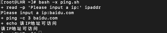 ping -c 3 $ipaddr &> /dev/null && echo '该IP地址可访问' || echo '该IP地址不可访问'
