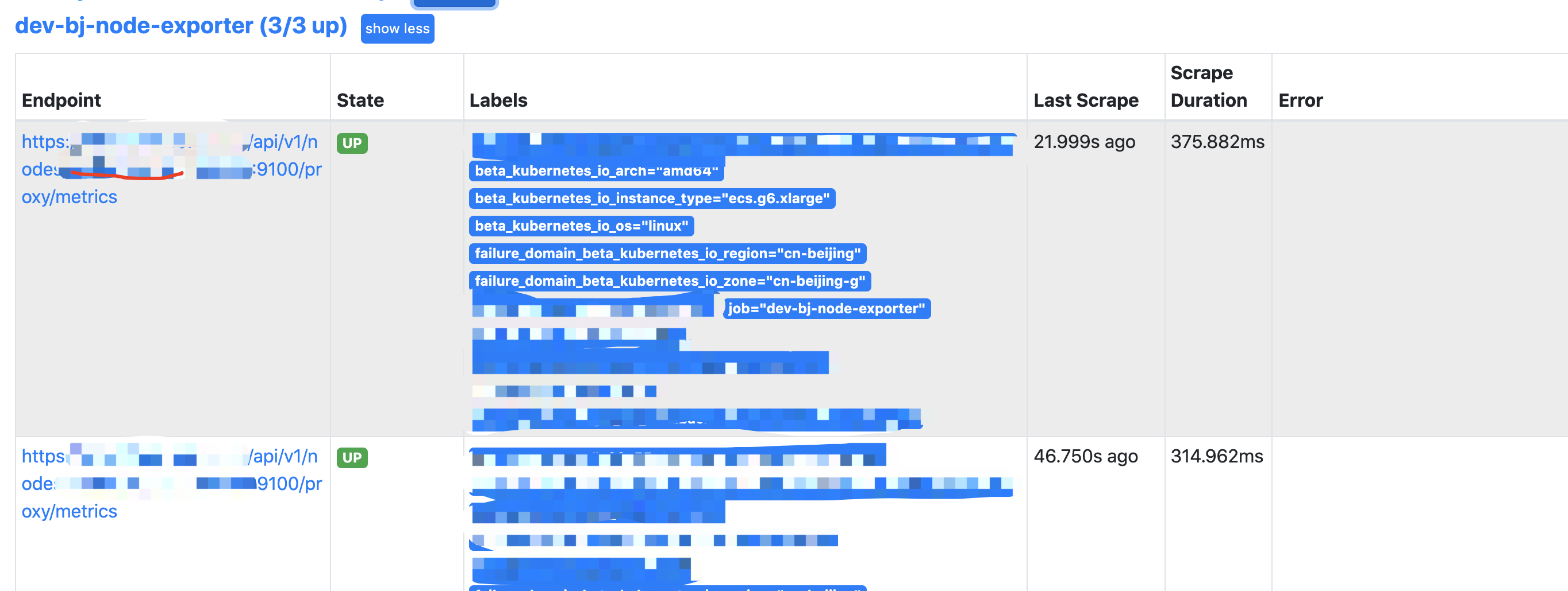 上表中Pod性能和Node性能的监控url其实都是自行构造的proxy url,而K8S资源使用默认的监控url,就会发现其endpoint都是K8S集群内部的私有ip,因此所有的状态都是down的。但是如果构建url,所有的状态都会是up。