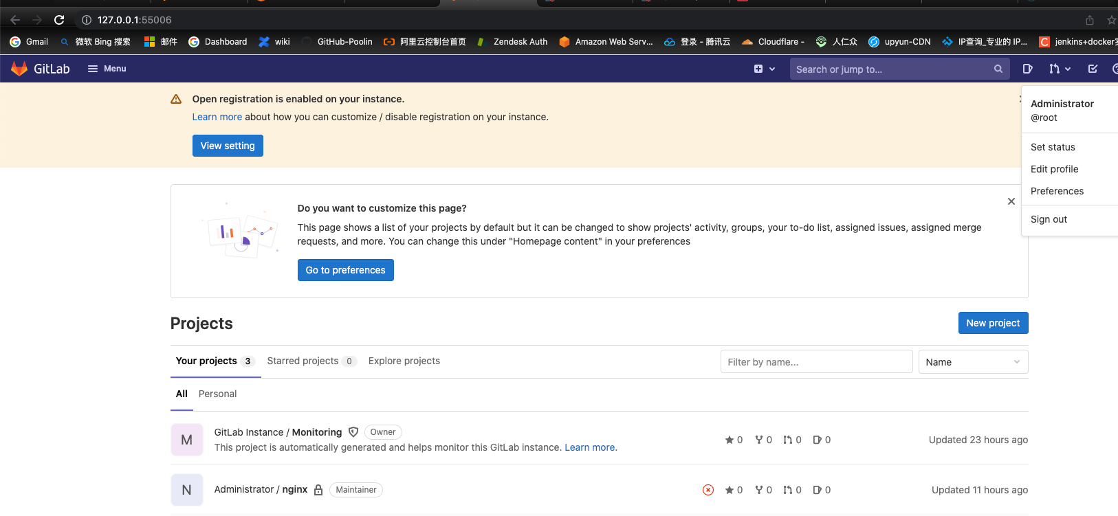 根据docker ps 可以查看jenkins和gitlab在本地映射的端口,本地的55009端口可以查看jenkins的页面,55006 可以查看本地的gitlab