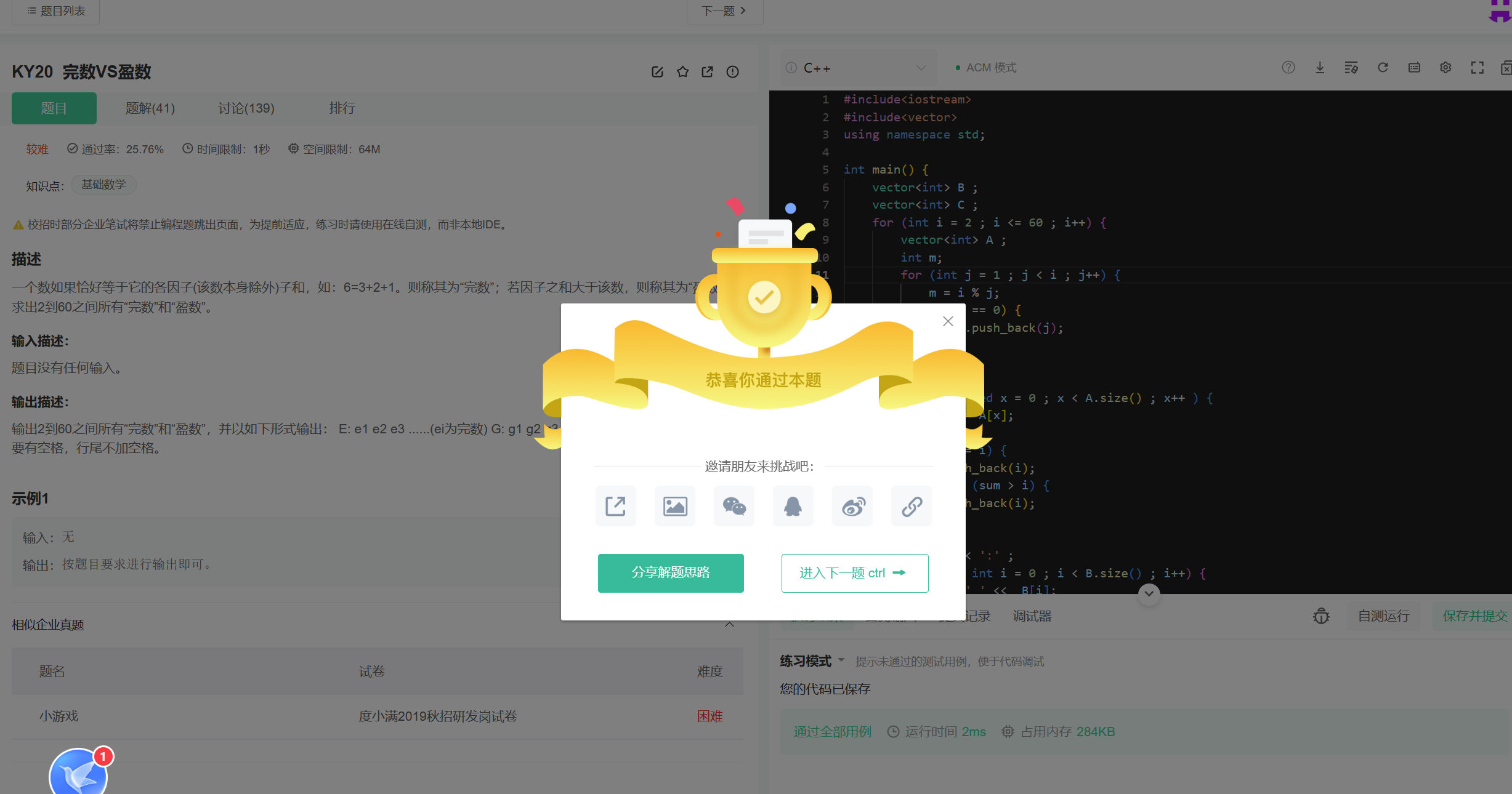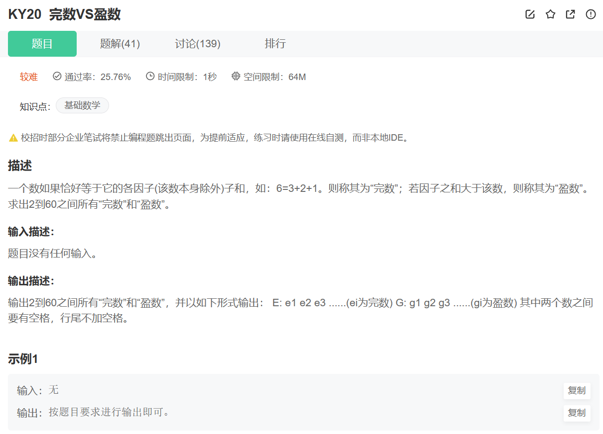 KY20 完数与盈数C++