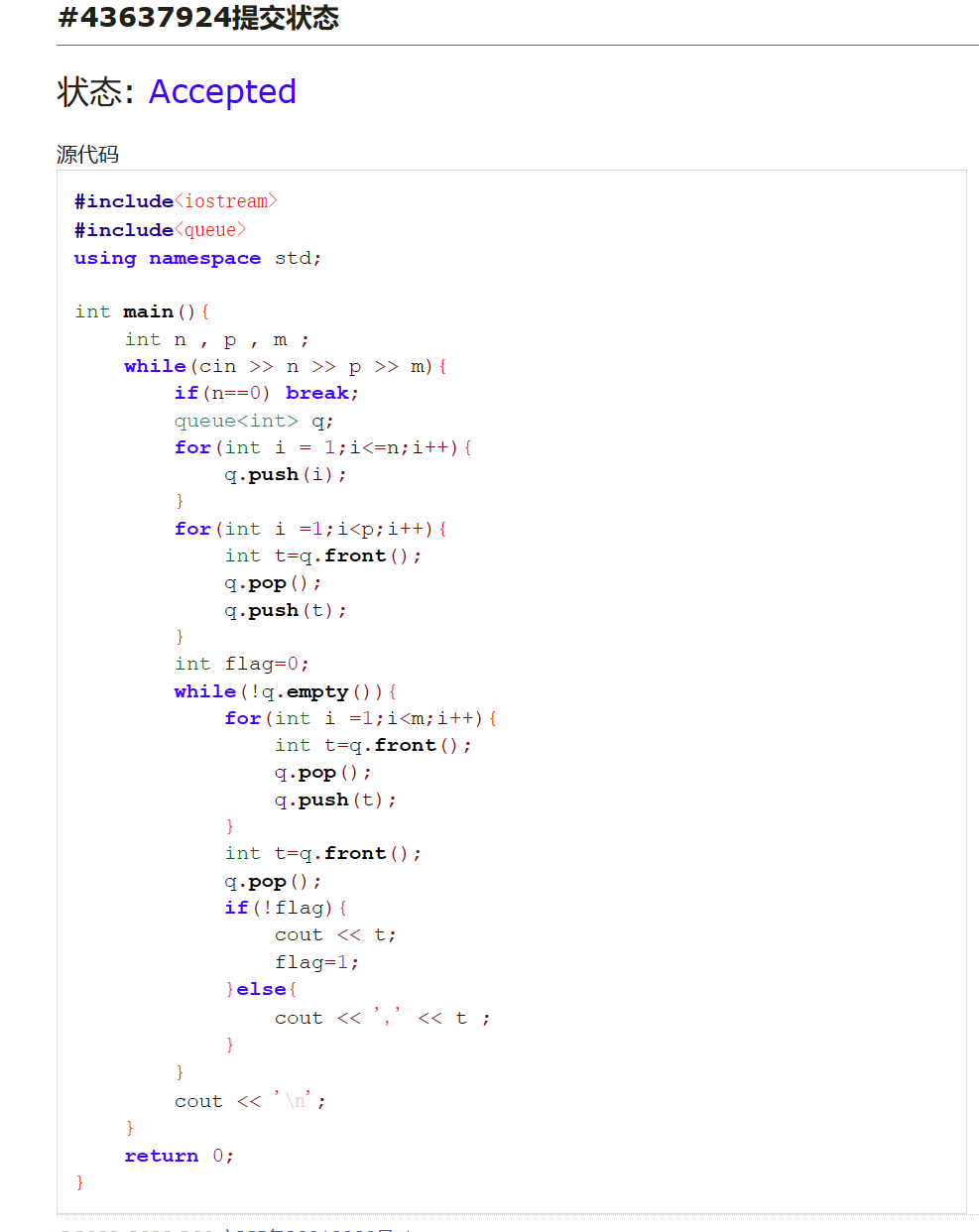 如果用数学的角度考虑。知道了n,p,m自然就知道下一个要出队的人的编号。然后一个个输出就行了。