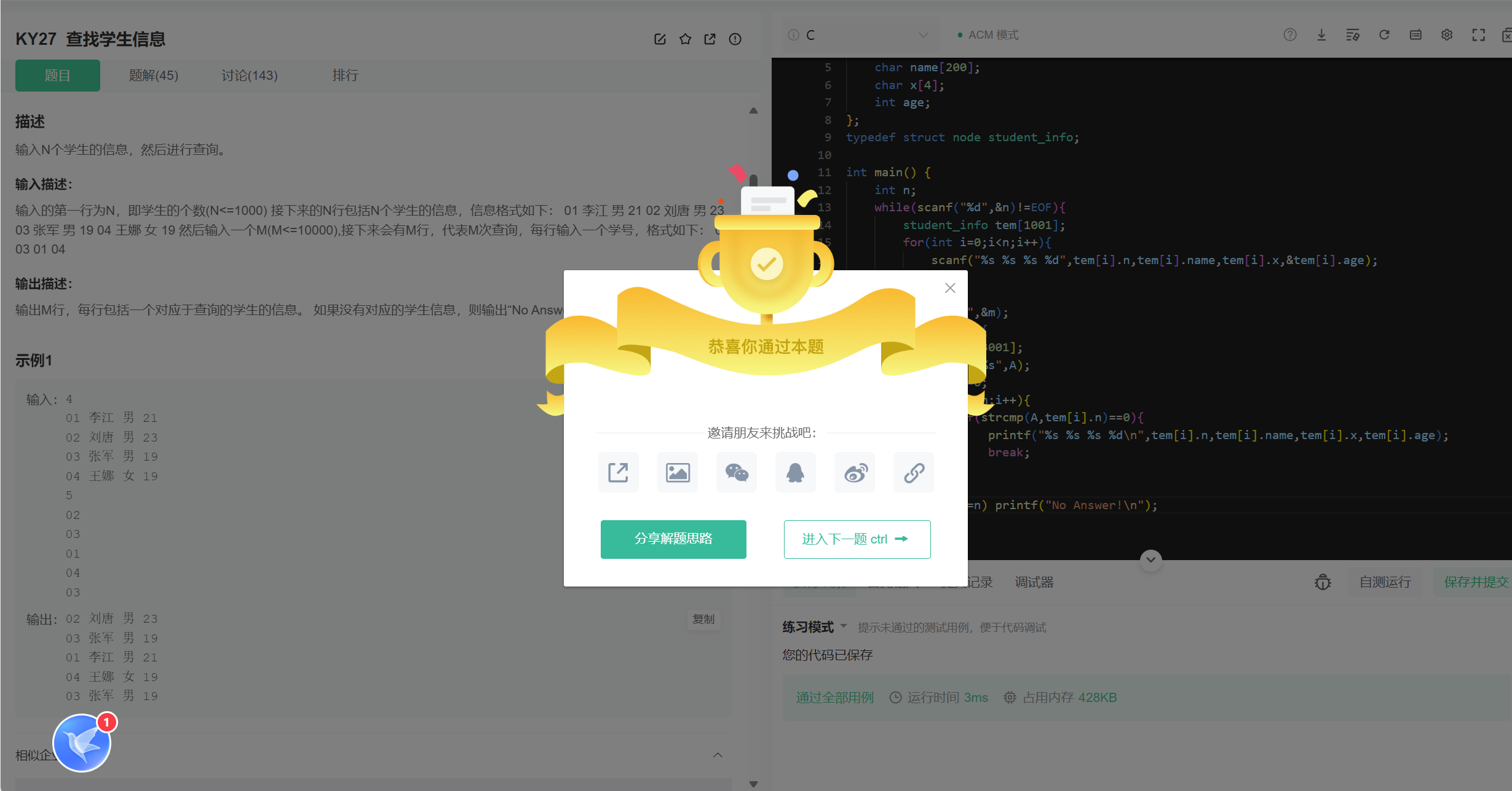 简单的结构体查找。要注意C语言中文字符占多个字节,输入输出中文要用%s。