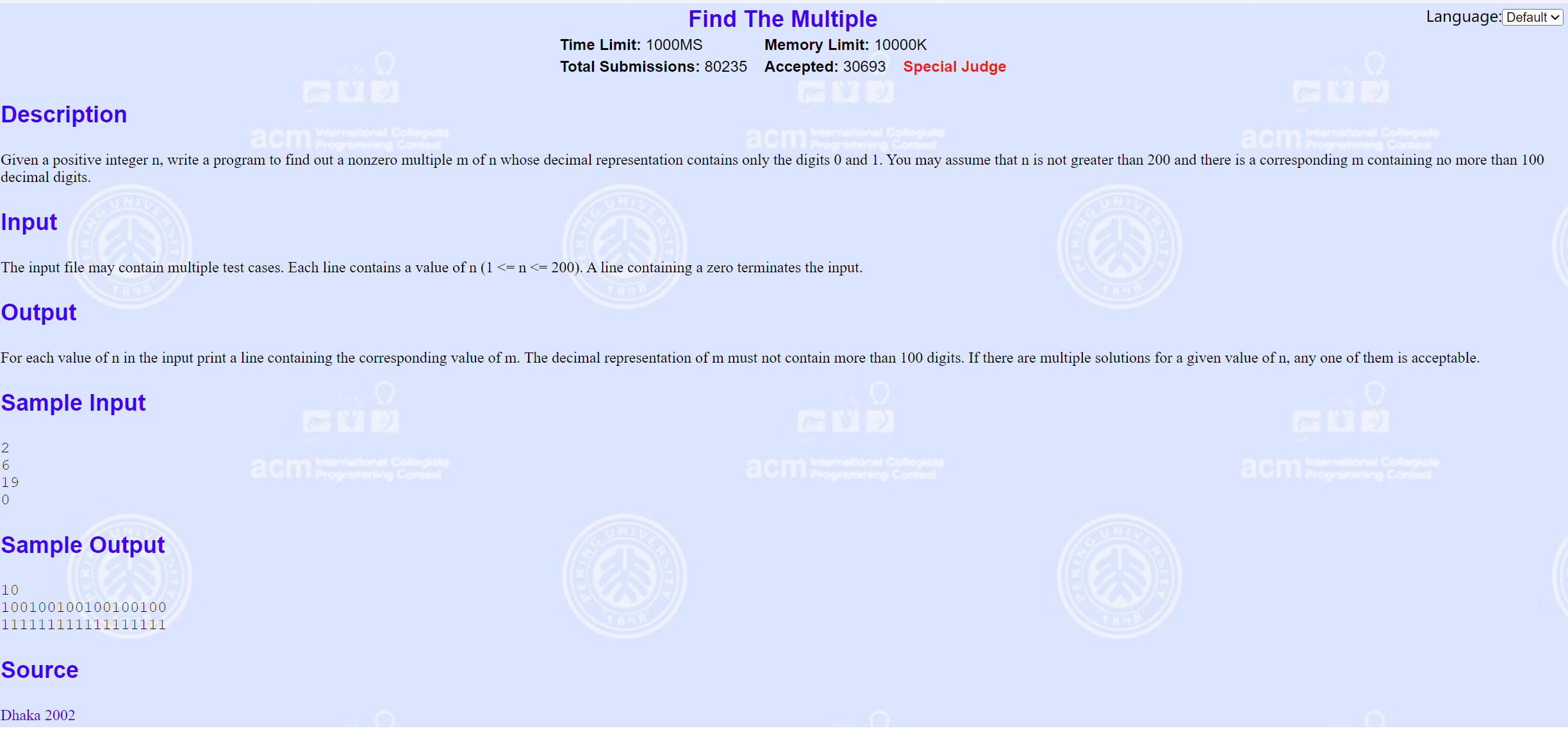 这题就是找N的倍数m,M要求是由1和0组成且非0。