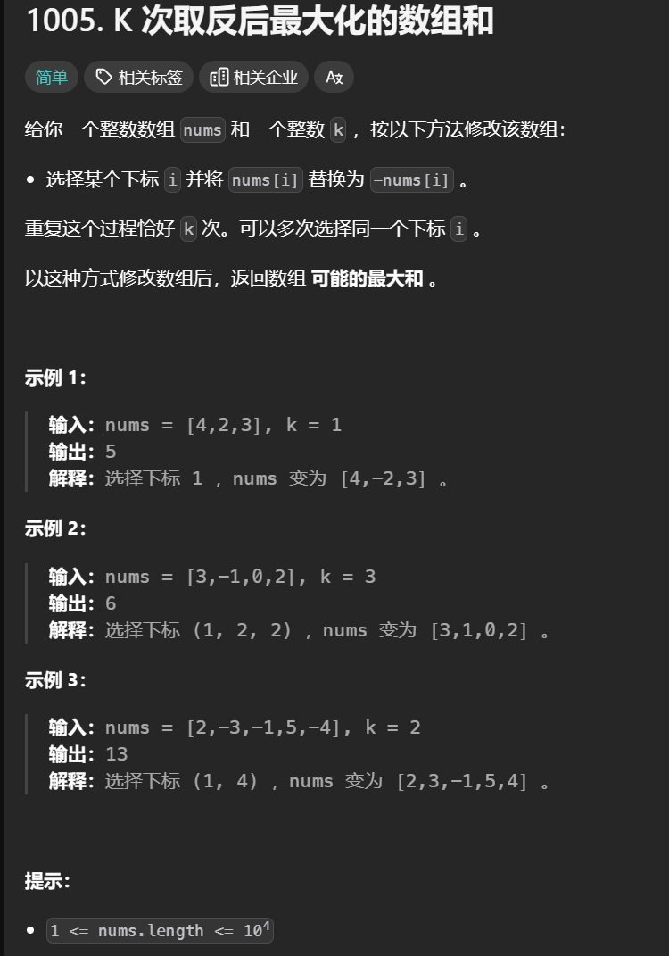 1005. K 次取反后最大化的数组和c