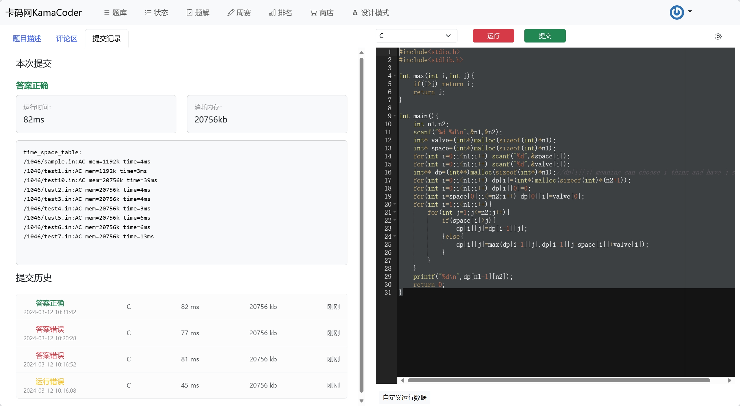 int** dp=(int**)malloc(sizeof(int*)*n1);//dp[i][j] meaning can choose i thing and have j space