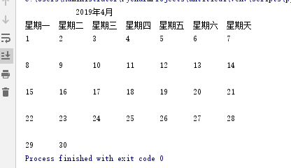 from datetime import datetime start_day=datetime(2019,4,1) end_day=datetime(2019,4,30) count = 0 print("\t\t\t2019年4月") print("星期一 星期二 星期三 星期四 星期五 星期六 星期天") for i in range (0,30): i=i+1 print(i,end="\t\t") count=count+1 if count%7==0: print("\n")