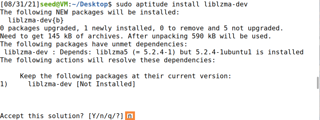 (3)用“aptitude”替换“apt-get”进行软件安装,并在第一个选择项选“n”即可成功安装;
