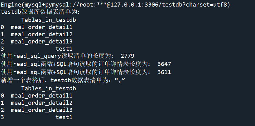 detail1.to_sql('test1',con=engine,index=False,if_exists='replace') #使用read_sql读取test表 formlist=pd.read_sql_query('show tables',con=engine) print('新增一个表格后,testdb数据库数据表清单为:','\n',formlist)