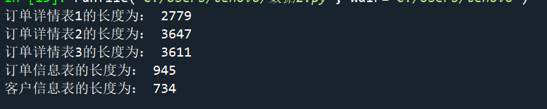 #4-9 #使用read_table读取菜品订单信息 from sqlalchemy import create_engine import pandas as pd engine=create_engine('mysql+pymysql://root:root@127.0.0.1:3306/testdb?charset=utf8') order1=pd.read_sql_table('meal_order_detail1',con=engine) print("订单详情表1的长度为:",len(order1)) order2=pd.read_sql_table('meal_order_detail2',con=engine) print("订单详情表2的长度为:",len(order2)) order3=pd.read_sql_table('meal_order_detail3',con=engine) print("订单详情表3的长度为:",len(order3)) #4-10 order4=pd.read_table('F:/桌面/第七章/meal_order_info.csv',sep=",",encoding='gbk') print('订单信息表的长度为:',len(order4)) #4-11 user=pd.read_excel('F:\桌面\第七章/users.xlsx') print('客户信息表的长度为:',len(user))
