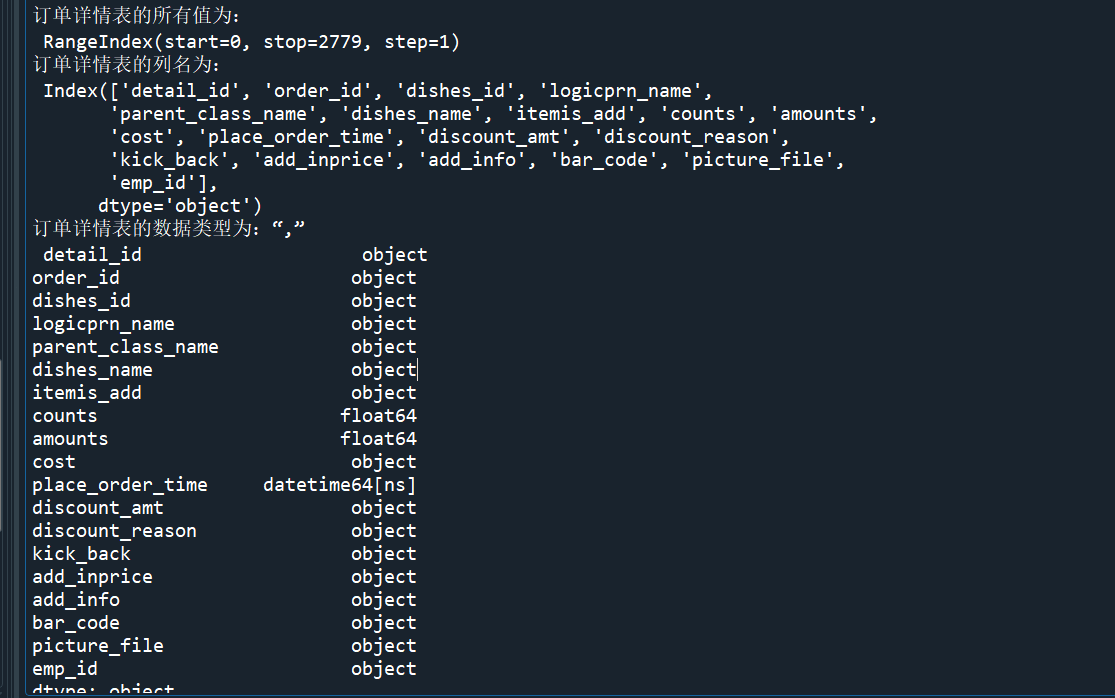print("使用read_sql函数+SQL语句读取的订单详情表长度为:",len(detail2))detail3=pd.read_sql('meal_order_detail3',con=engine)