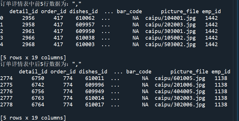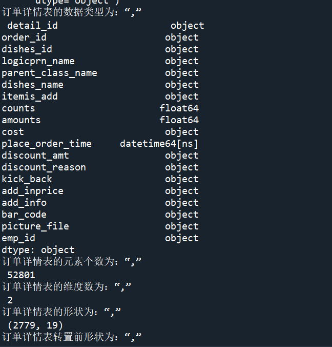print("使用read_sql_query读取清单的长度为:",len(detail1))detail2=pd.read_sql('select*from meal_order_detail2',con=engine)