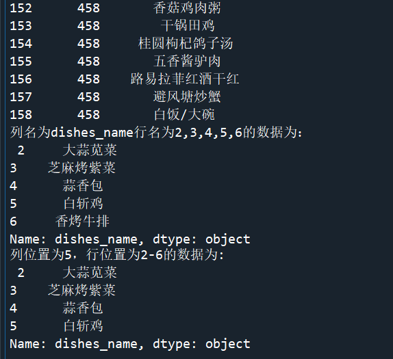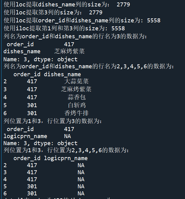 from sqlalchemy import create_engine import pandas as pd engine=create_engine('mysql+pymysql://root:root@127.0.0.1:3306/testdb?charset=utf8') detail1=pd.read_sql_table('meal_order_detail1',con=engine) import pandas as pd dishes_name1=detail1.loc[:,'dishes_name'] print('使用loc提取dishes_name列的size为:',dishes_name1.size) dishes_name2=detail1.iloc[:,3] print('使用loc提取第3列的size为:',dishes_name2.size) orderDish1=detail1.loc[:,['order_id','dishes_name']] print('使用loc提取order_id和dishes_name列的size为:',orderDish1.size) orderDish2=detail1.iloc[:,[1,3]] print('使用iloc提取第1列和第3列的size为:',orderDish2.size) print('列名为order_id和dishes_name的行名为3的数据为:\n',detail1.loc[3,['order_id','dishes_name']]) print('列名为order_id和dishes_name的行名为2,3,4,5,6的数据为:\n',detail1.loc[2:6,['order_id','dishes_name']]) print('列位置为1和3,行位置为3的数据为:\n',detail1.iloc[3,[1,3]]) print('列位置为1和3,行位置为2,3,4,5,6的数据为:\n',detail1.iloc[2:7,[1,3]]) #loc内部传送表达式 print('detail中order为458的dishes_name为;\n',detail1.loc[detail1['order_id']=='458',['order_id','dishes_name']]) print('detail中order_id为458的1、5列数据为:\n',detail1.iloc[(detail1['order_id']=='458').values,[1,5]]) print('列名为dishes_name行名为2,3,4,5,6的数据为:\n',detail1.loc[2:6,'dishes_name']) print('列位置为5,行位置为2-6的数据为:\n',detail1.iloc[2:6,5])