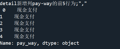from sqlalchemy import create_engine import pandas as pd engine=create_engine('mysql+pymysql://root:root@127.0.0.1:3306/testdb?charset=utf8') detail1=pd.read_sql_table('meal_order_detail1',con=engine) detail1['pay_way']='现金支付' print('detail新增列pay-way的前5行为;","\n',detail1['pay_way'].head())