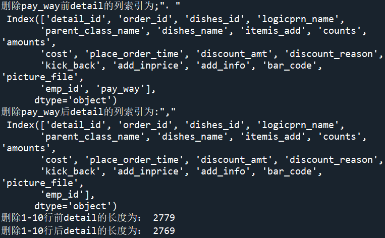 from sqlalchemy import create_engine import pandas as pd engine=create_engine('mysql+pymysql://root:root@127.0.0.1:3306/testdb?charset=utf8') detail1=pd.read_sql_table('meal_order_detail1',con=engine) detail1['pay_way']='现金支付' print('删除pay_way前detail的列索引为;","\n',detail1.columns) detail1.drop(labels='pay_way',axis=1,inplace=True) print('删除pay_way后detail的列索引为:","\n',detail1.columns) print('删除1-10行前detail的长度为:',len(detail1)) detail1.drop(labels=range(1,11),axis=0,inplace=True) print('删除1-10行后detail的长度为:',len(detail1))