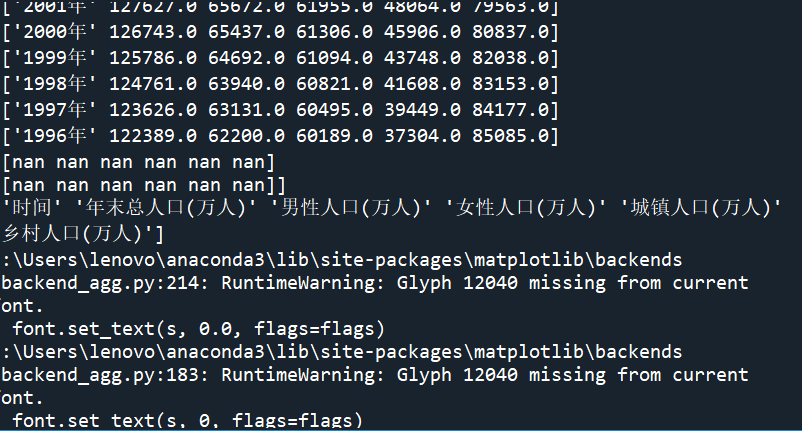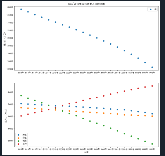 import numpy as np import matplotlib.pyplot as plt #使⽤numpy库读取⼈⼝数据 data=np.load('F:/桌面/第七章/populations.npz',allow_pickle=True) print(data.files)#查看⽂件中的数组 print(data['data']) print(data['feature_names']) plt.rcParams['font.sans-serif'] = 'SimHei' # 设置中文显示 plt.rcParams['axes.unicode_minus'] = False# 防止字符无法显示 name=data['feature_names']#提取其中的feature_names数组,视为数据的标签 values=data['data']#提取其中的data数组,视为数据的存在位置 p1=plt.figure(figsize=(12,12))#确定画布⼤⼩ pip1=p1.add_subplot(2,1,1)#创建⼀个两⾏⼀列的⼦图并开始绘制 #在⼦图上绘制散点图 plt.scatter(values[0:20,0],values[0:20,1])#,marker='8',color='red' plt.ylabel('总人口(万⼈)') plt.legend('年末') plt.title('1996~2015年末与各类人口散点图') pip2=p1.add_subplot(2,1,2)#绘制⼦图2 plt.scatter(values[0:20,0],values[0:20,2])#,marker='o',color='yellow' plt.scatter(values[0:20,0],values[0:20,3])#,marker='D',color='green' plt.scatter(values[0:20,0],values[0:20,4])#,marker='p',color='blue' plt.scatter(values[0:20,0],values[0:20,5])#,marker='s',color='purple' plt.xlabel('时间') plt.ylabel('总人口(万人)') plt.xticks(values[0:20,0]) plt.legend(['男性','女性','城镇','乡村']) #在⼦图上绘制折线图 p2=plt.figure(figsize=(12,12)) p1=p2.add_subplot(2,1,1) plt.plot(values[0:20,0],values[0:20,1])#,linestyle = '-',color='r',marker='8' plt.ylabel('总人口(万人)') plt.xticks(range(0,20,1),values[range(0,20,1),0],rotation=45)#rotation设置倾斜度 plt.legend('年末') plt.title('1996~2015年末总与各类人口折线图') p2=p2.add_subplot(2,1,2) plt.plot(values[0:20,0],values[0:20,2])#,'y-' plt.plot(values[0:20,0],values[0:20,3])#,'g-.' plt.plot(values[0:20,0],values[0:20,4])#,'b-' plt.plot(values[0:20,0],values[0:20,5])#,'p-' plt.xlabel('时间') plt.ylabel('总人口(万人)') plt.xticks(values[0:20,0]) plt.legend(['男性','女性','城镇','乡村']) #显⽰图⽚ plt.show()