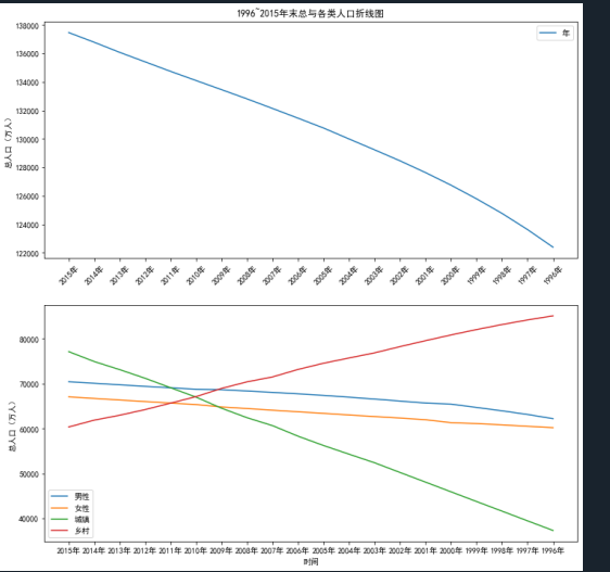 人口数据总共拥有6个特征,分别为年末总人口、男性人口、女性人口、城镇人口、乡村人口和年份。查看各个特征随着时间推移发生的变化情况可以分析出未来男女人口比例、城乡人口变化的方向。