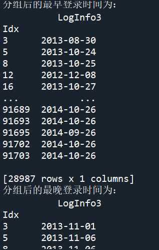import pandas as pd import numpy as np LogInfo = pd.read_csv('F:/桌面/第七章/Training_LogInfo.csv',encoding='gbk') Userupdate = pd.read_csv('F:/桌面/第七章/Training_Userupdate.csv',encoding='gbk') # 使用groupby方法对用户信息更新表和登录信息表进行分组 LogGroup = LogInfo[['Idx','LogInfo3']].groupby(by = 'Idx') UserGroup = Userupdate[['Idx','UserupdateInfo2']].groupby(by = 'Idx') #代码18-2 # 使用agg方法求取分组后的最早,最晚,更新登录时间 print('分组后的最早登录时间为:\n',LogGroup.agg(np.min)) print('分组后的最晚登录时间为:\n',LogGroup.agg(np.max)) print('分组后的最早更新时间为:\n',UserGroup.agg(np.min)) print('分组后的最晚更新时间为:\n',UserGroup.agg(np.max)) #代码18-3 # 使用size方法求取分组后的数据的信息更新次数与登录次数 print('分组后的数据的信息更新次数为:\n',LogGroup.size()) print('分组后的数据的登录次数为:\n',UserGroup.size())
