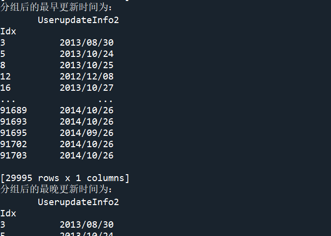 (2)使用agg方法求取分组后的最早和最晚更新及登录时间。