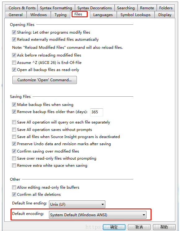 b)对于所有的项目文件,需要在新建项目之前(如果项目已存在,需要先将该项目删除),点击"Options"->"Preferences...",打开"Preferences"窗口,然后在该窗口中选择"Files"标签,将"Files"标签中的"Default encoding"选项设置为"System Default(Windows ANSI)",点击"确定"保存设置。如下图: