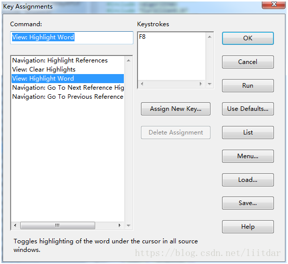 点击"Options"->"Key Assignments",打开"Key Assignments"窗口。在该窗口中,可以查看或修改指定功能的快捷键设置。例如,要查看标记高亮状态的快捷键,可以在"Key Assignments"窗口中搜索相应的关键字,查看对应的快捷键,如下图: