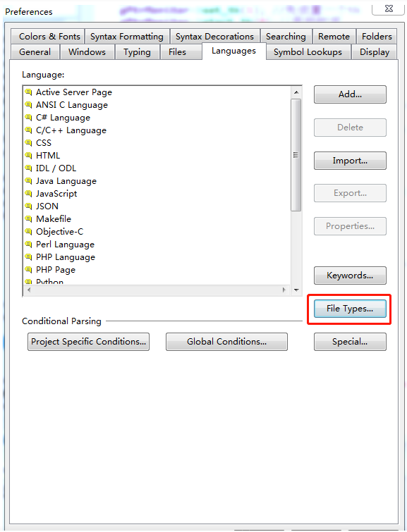 在上图中,选择你想要修改的编程语言(本文中使用的是C/C++),然后点击"File Types...",打开"File Types Options"窗口,如下: