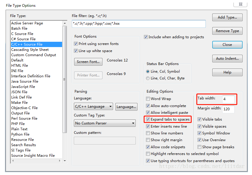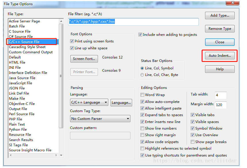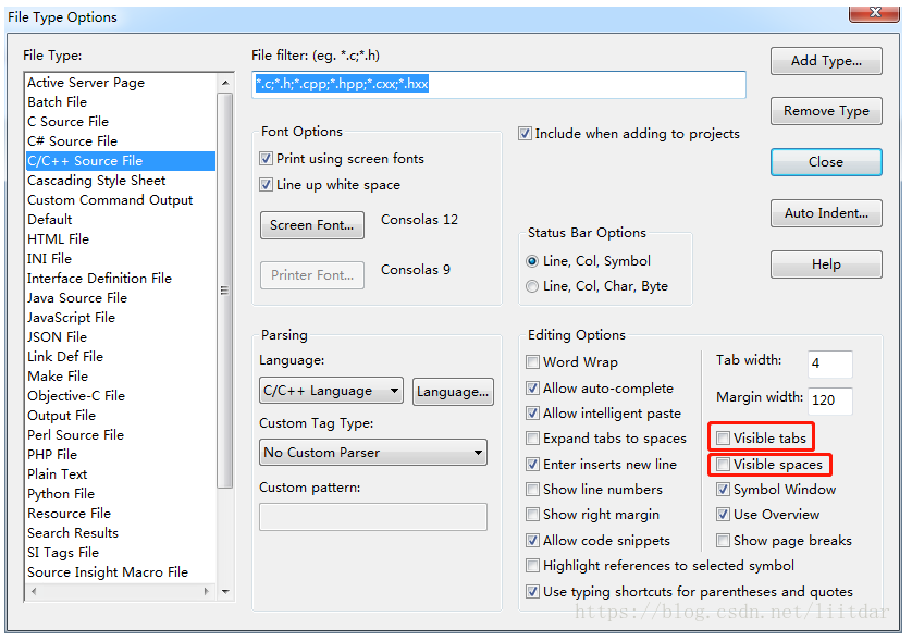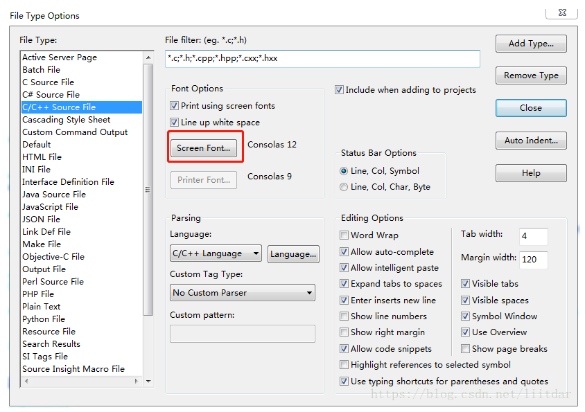点击"Options"->"File Type Options",打开"File Type Options"窗口,在该窗口左侧选择要设置的文件类型(如"C/C++源文件"),如下图: