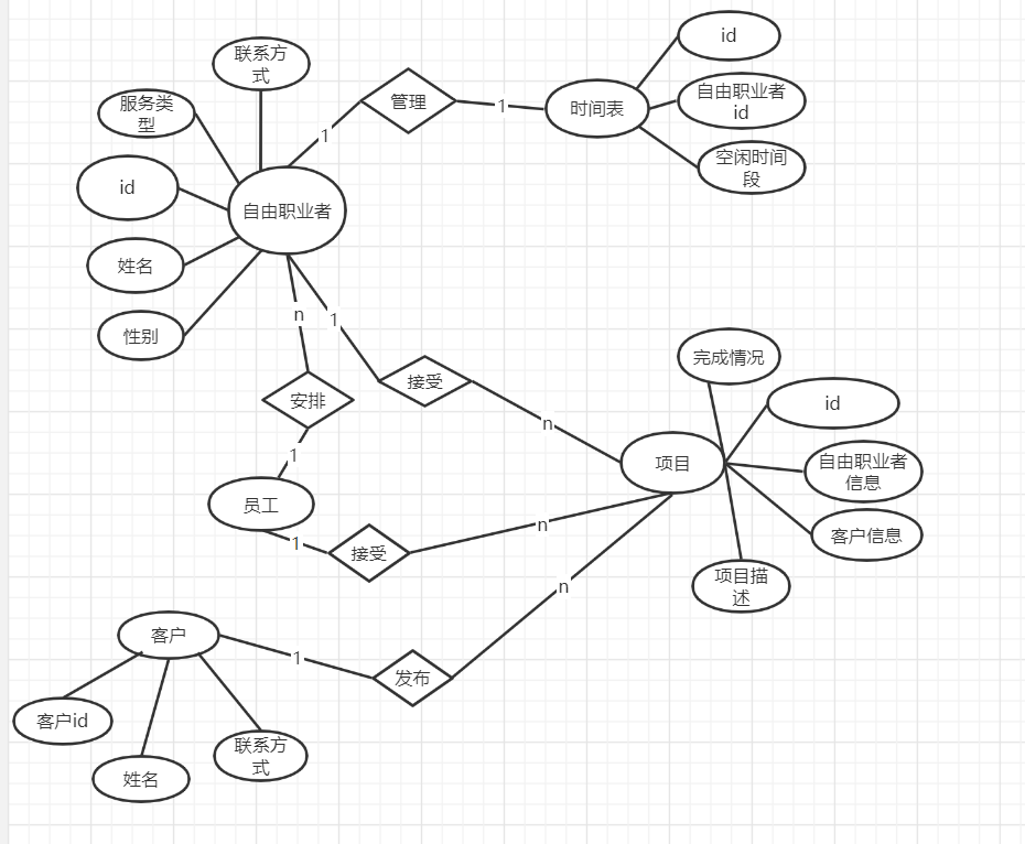 3.项目表:id、项目描述、自由职业者信息、服务对象信息、项目类型、完服成情况