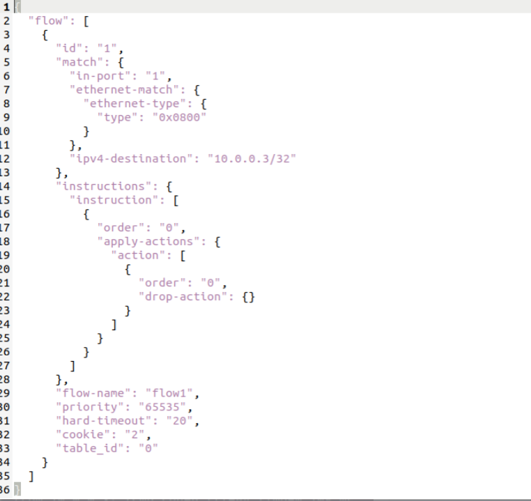 (3) 编写Python程序,调用OpenDaylight的北向接口下发硬超时流表,实现拓扑内主机h1和h3网络中断20s。