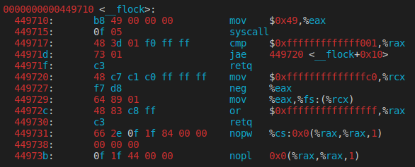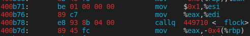 可以看到,第一个参数通过寄存器eax移动到edi中,第二个参数0x1移动到esi中,然后执行系统调用flock.