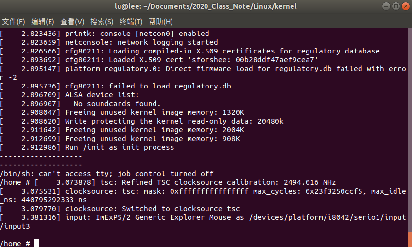 #!/bin/sh mount -t proc none /proc mount -t sysfs none /sys echo "-------------------" echo "--------------------" cd home /bin/sh给init脚本添加可执行权限