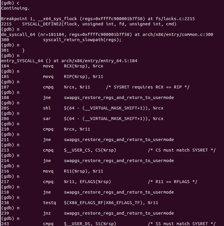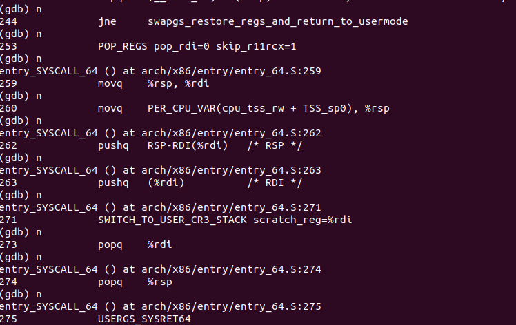然后在gdb单步调试中,我们可以看到从syscall_return_slowpath返回后,开始恢复现场。主要是将之前保存在栈中的寄存器的值,重新恢复到原来的寄存器中。
