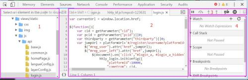 2.这个地方使用来调试js代码的地方,这个非常重要,看到行号上面有蓝色的标签,这个标签就是断电,当我们需要调试程序的时候打一个断电,然后通过3这个工具栏进行调试,那么调试过程就不详细解释,也就是打一个断电然后刷新页面程序会调到你打断点的地方,然后通过4来查看程序中变量的值什么的。