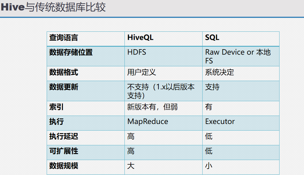 7. 数据规模。由于 Hive 建立在集群上并可以利用 MapReduce 进行并行计算,因此可以支持很大规模的数据;对应的,数据库可以支持的数据规模较小。