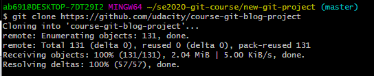 输入命令 git clone,然后输入你要克隆的 Git 仓库的路径。使用此命令进行:git clone https://github.com/udacity/course-git-blog-project