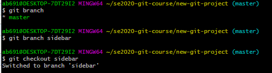 用git branch sidebar来创建名为sidebar的分支,用git checkout sidebar切换到sidebar分支。