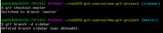 运行git checkout master命令,切换到master分支,运行git branch -d sidebar命令,删除sidebar分支。