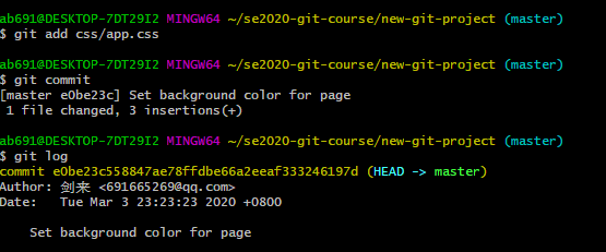 保存文件,然后将该文件添加到暂存区,并将其 commit 到仓库。 commit 的内容可写:Set background color for page 通过git log 检查commit 记录。
