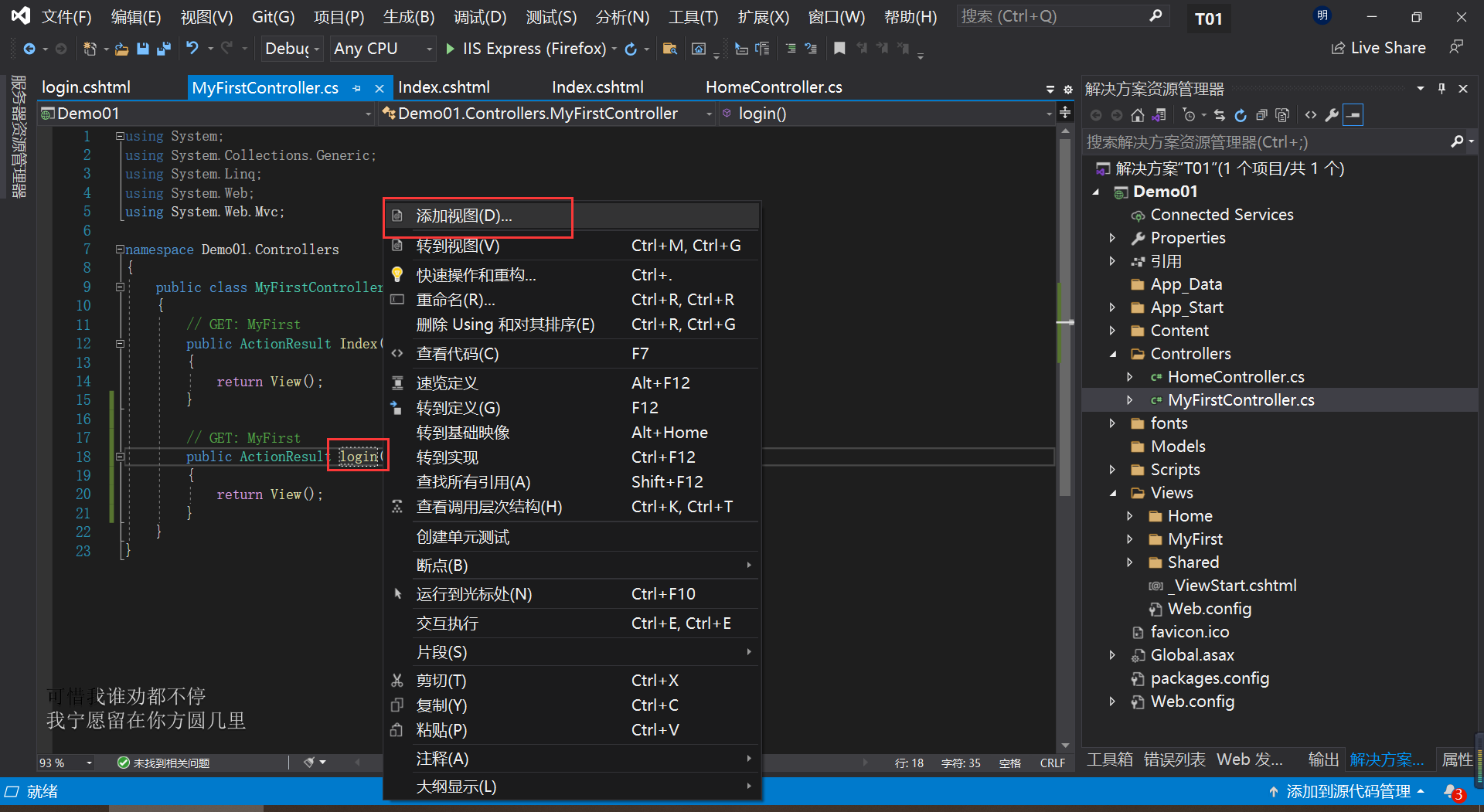 a.在新建一个MVC项目后,在Controllers文件夹添加一个新的MyfirstController类