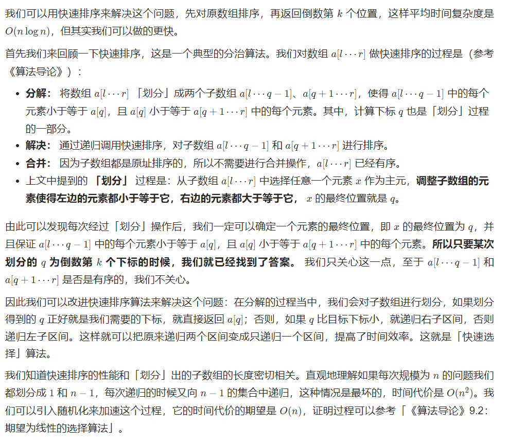 和 215 题一样,使用基于快速排序的快速选择,注意在选择之前先用 shuffle 打乱数组。