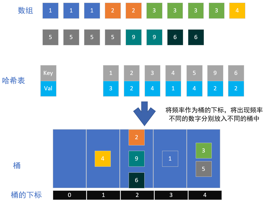 创建桶,以整数出现的频率作为数组的下标,每个桶中存放相同出现频率的整数集合;