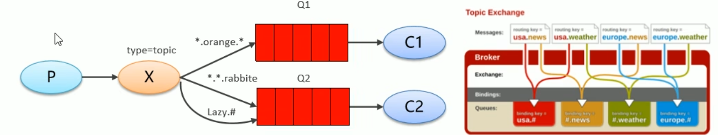 - 需要设置类型为 topic 的交换机,交换机和队列进行绑定,并且指定通配符方式的 routing key,当发送消息到交换机后,交换机会根据routing key 将消息发送到对应的队列。