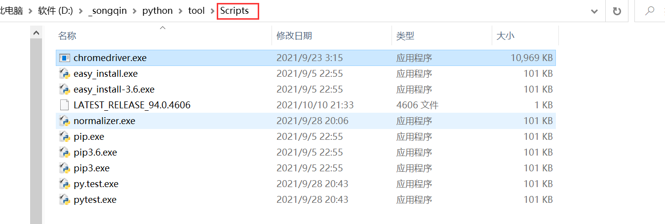 下载完成后解压,得到 chromedriver.exe,将其放入 Python 安装路径下的Scripts目录