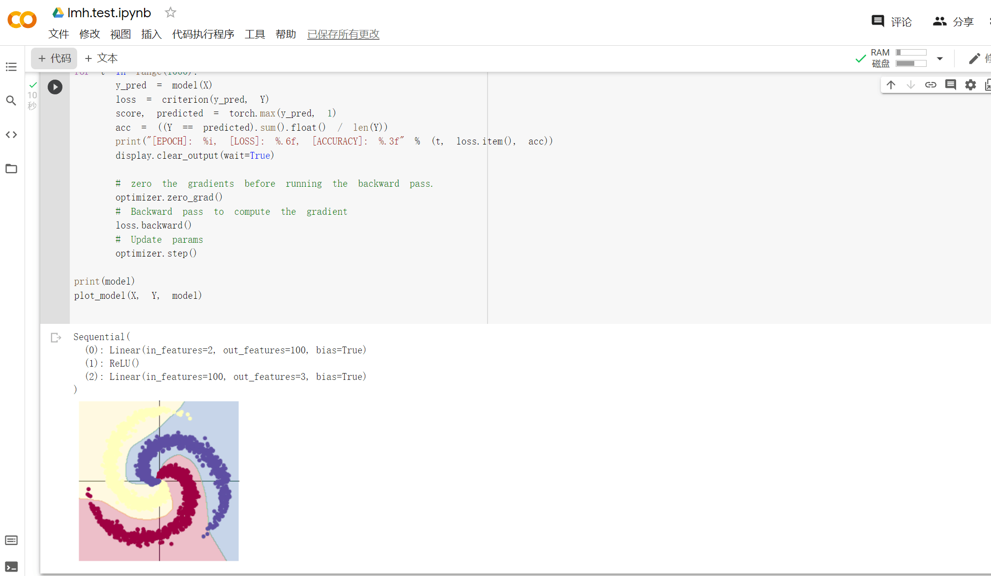 实验心得:本实验通过构建线性模型和神经网络模型来解决螺旋数据分类的问题。实验里的螺旋数据分类是一个非线性问题,即给出的样本点不是线性可分的。线性模型由于是线性方程的组合,没有非线性因素的存在,因此不管怎么组合,最后得到的分类器本质还是一个线性方程,在解决这类非线性问题上效果有限。而神经网络模型增加了一个激活函数(用来增加非线性因素),通过该函数的作用,输出明显是非线性的。同时。增加的Relu函数相比sigmoid、tanh函数具有网络训练快(导数好求)和不会出现梯度消失(非饱和函数)的优点。