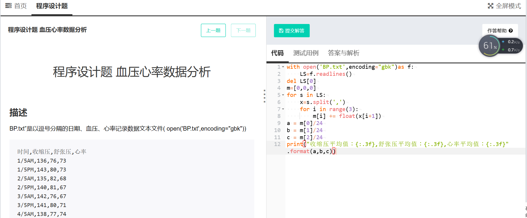 “BP.txt”是以逗号分隔的日期、血压、心率记录数据文本文件( open('BP.txt',encoding="gbk"))