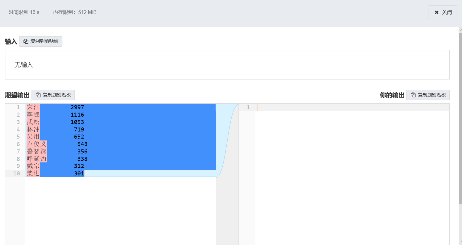 使用词频统计的方法,生成《水浒传》出场次数最多的10个人物的姓名。