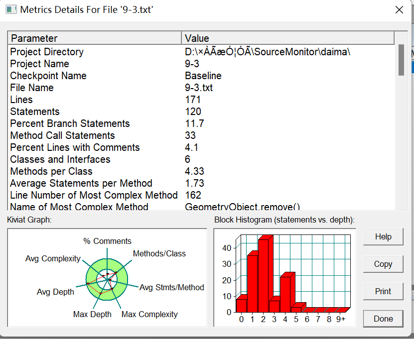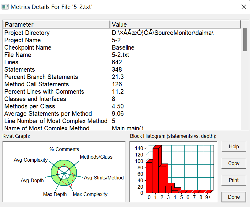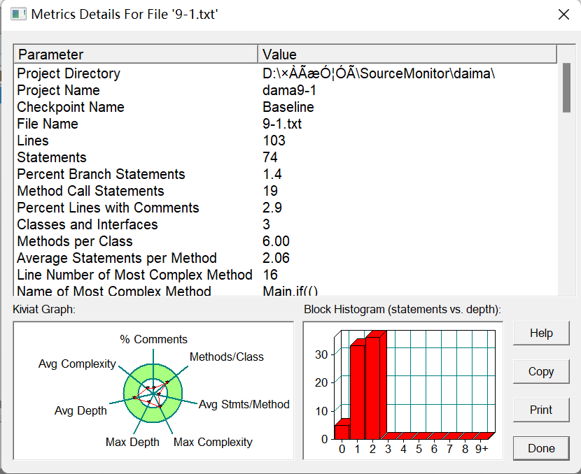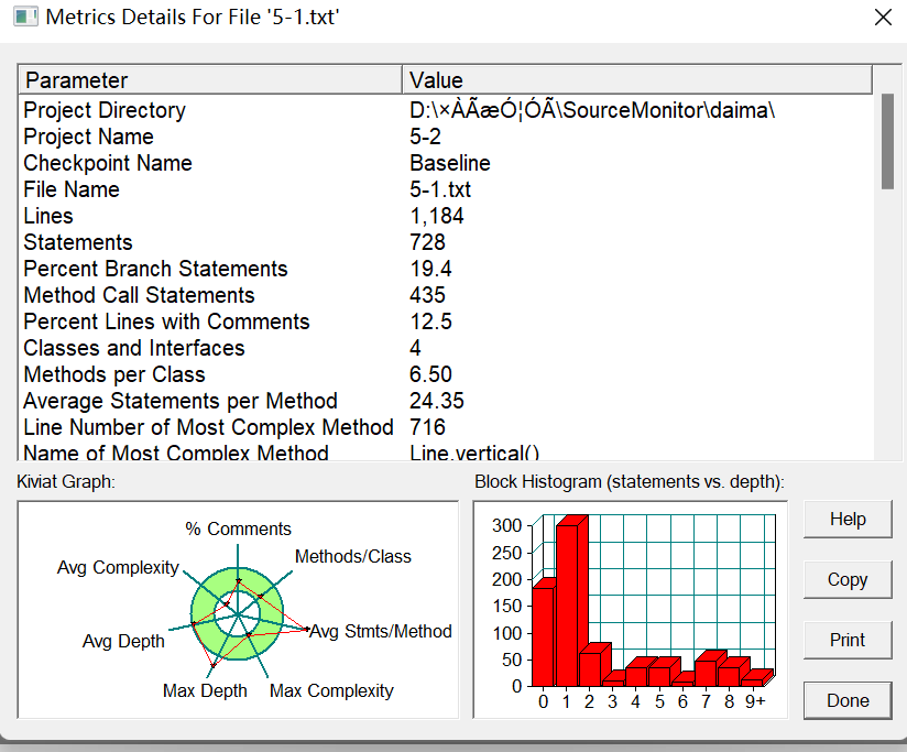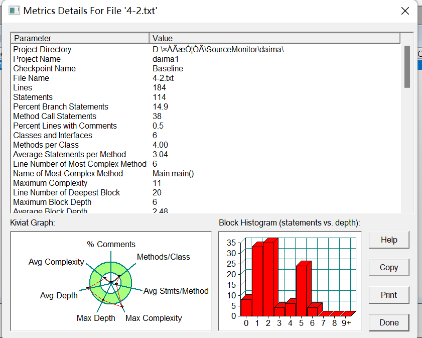 由上图可知:Avg Depth过大,很大的原因是部分函数中if-else语句(分支嵌套层数)用的太多。而Avg Stmts/Method过大,说明我的函数有部分语句过多,导致平均每个函数包含的语句数过大。