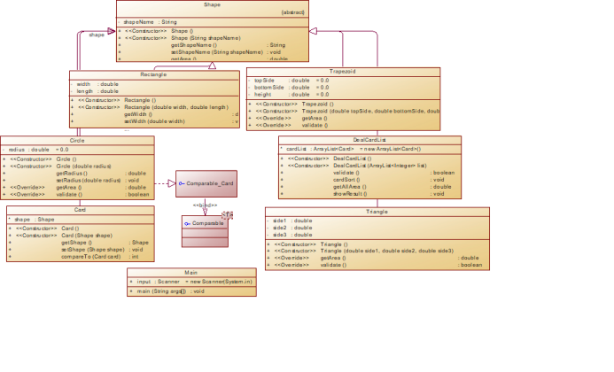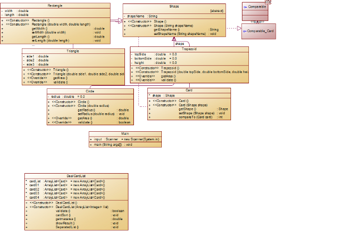 两道题目都需要用到继承和接口,继承都是circle,rectangle等类继承自Shape类,子类都重写了父类的getArea()和validate()的方法,而接口则是用来比较card的面积的大小;也用到了card类型的自定义列表,用于添加创建的card对象;在对列表进行排序的时候使用了Collections的swap方法;